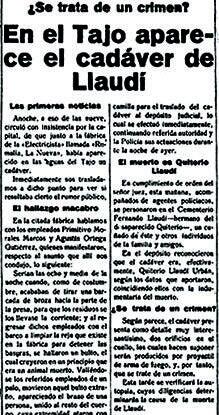De inmediato, dieron aviso a la comisaría y pidieron permiso para orillar el cadáver, no fuera a desprenderse y corriese aguas abajo. Personados allí el forense, el juez, y agentes policiales no tardaron en reconocer a la víctima como Quiterio Llaudí. A su cintura tenía atada una soga de esparto, en cuyo extremo figuraban restos de unos nudos que bien podrían haber servido para lastrar el cuerpo con una piedra.